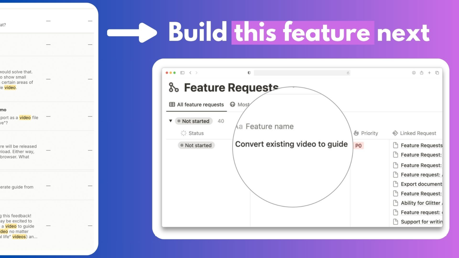 - Prioritization and Building: I throw all these insights into Notion, where I count how many times each feature request has appeared. This allows me to prioritize the most important features. The feature that ranks the highest is the one I build. And true story, I built this specific feature with the help of Gemini.